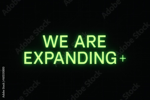 Glowing green text on a dark background stating "WE ARE EXPANDING+" evokes a sense of growth and business development.