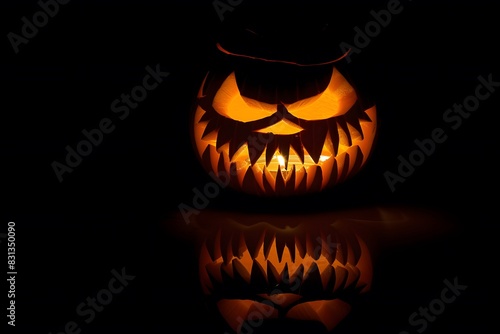 Glowing Halloween Pumpkin Face with Fangs on Black Background