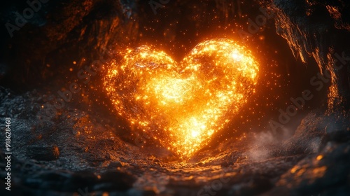 Glowing heart-shaped molten rock in a dark cavern - generative ai