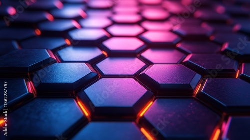 Glowing hexagonal pattern, dark metallic surface, vibrant pink and blue hues