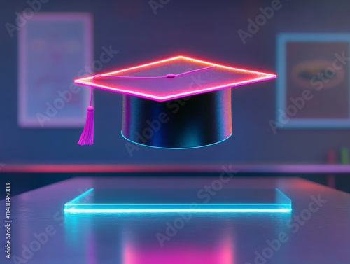 glowing holographic graduation cap floating above sleek surface, symbolizing achievement and celebration