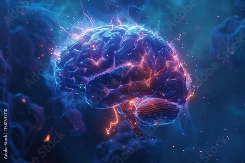 Glowing Human Brain Sparking Neural Activity Amid Deep Blue Cosmic Setting