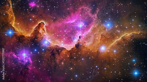 Glowing interstellar scene with colorful nebulae and distant stars on a cosmic purple background