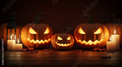 Glowing jack o lantern pumpkins arranged for Halloween celebration night