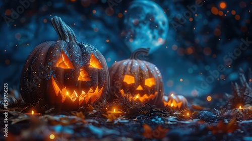 Glowing Jack-o'-Lanterns in a Dark Forest on Halloween Night