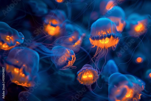 Glowing jellyfish float gracefully in the dark ocean depths, their ethereal forms illuminating the surrounding water.