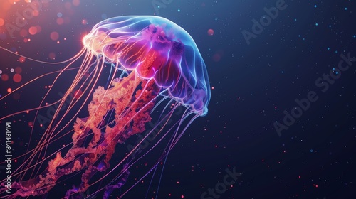 Glowing Jellyfish Floating Gracefully In Deep Blue Ocean With Long Tentacles And Translucent Bell, Beautiful Underwater Marine Life