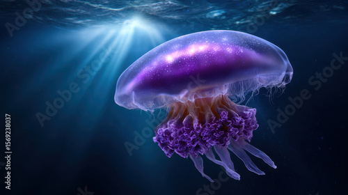 Glowing jellyfish floats gracefully deep blue water, illuminated by soft beams of light from above, creating serene atmosphere