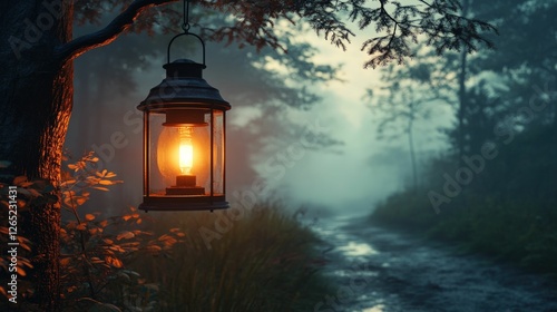 Glowing lantern hangs in misty forest stream