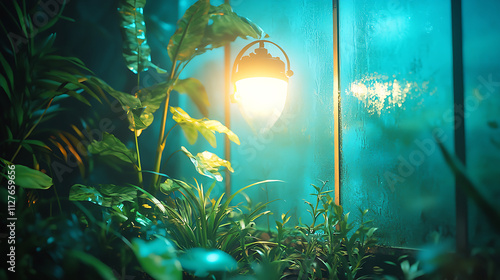 glowing lantern illuminates lush greenhouse filled with vibrant plants, creating serene and enchanting atmosphere at night