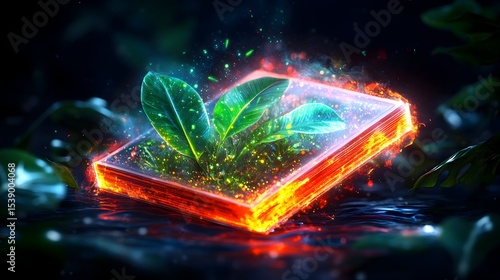 Glowing leaves emerge from fiery cube, jungle backdrop, fantasy concept