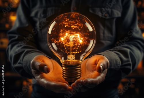 Glowing light bulb in mans hand