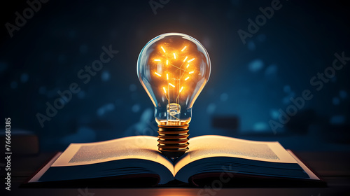 Glowing light bulb on book, reading inspiration concept, innovation idea