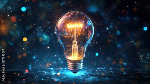 Glowing lightbulb, digital network, cosmic background, idea concept, web banner