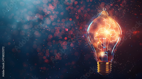 glowing lightbulb made of digital particles on dark gradient background, concept of creativity and innovation, ad banner layout with copy space