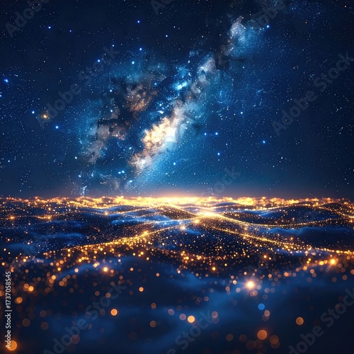 Glowing lights under the sky, waves. Starry night, magic