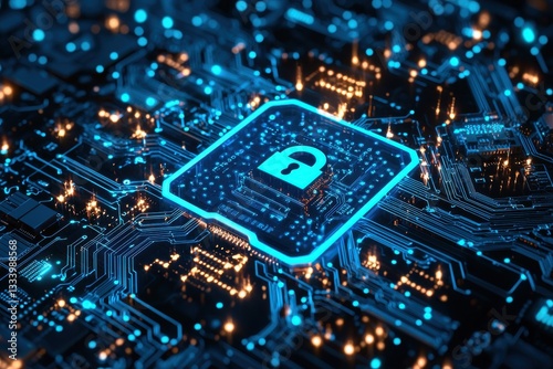 glowing lock on a circuit board symbolizing data security, protection, and technological advancement