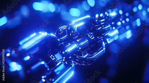 Glowing mechanical chain links rotating in dark space with bokeh
