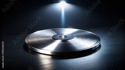 Glowing metallic disc resting on a sleek black surface illuminated by a bright spotlight , industrial, reflective