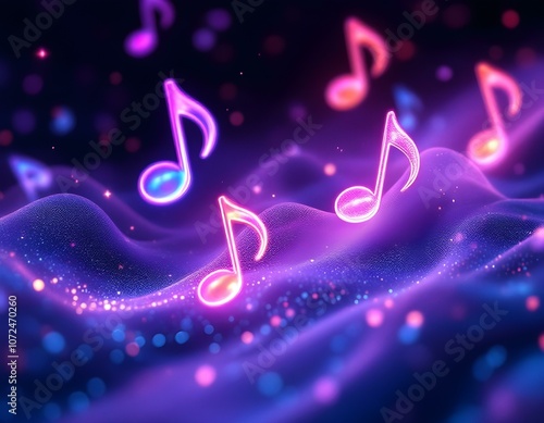 Glowing Metallic Silver and Gold Musical Notes with Light Waves on Black Background - Abstract Rhythm and Harmony