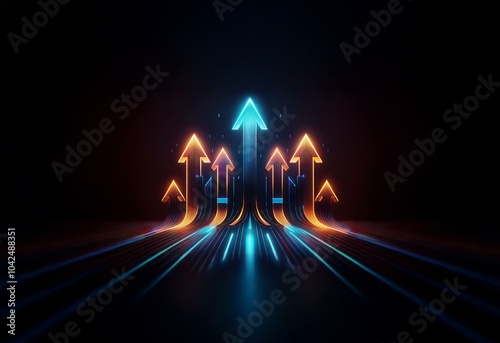 Glowing neon arrows point upwards, signifying growth and progress, set against a dark background.