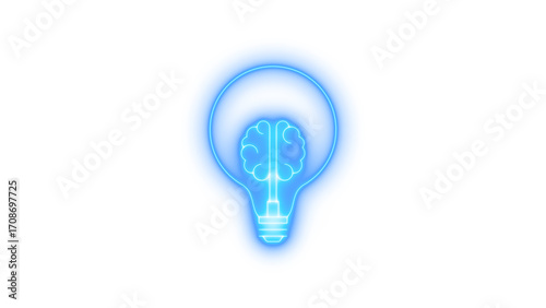 Glowing neon blue brain inside a lightbulb symbol, representing innovation, ideas, and intelligence with a bright glow on transparent background