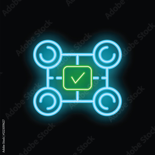 Glowing neon blue flowchart with a bright green check mark in the center square, representing a successful process or decision