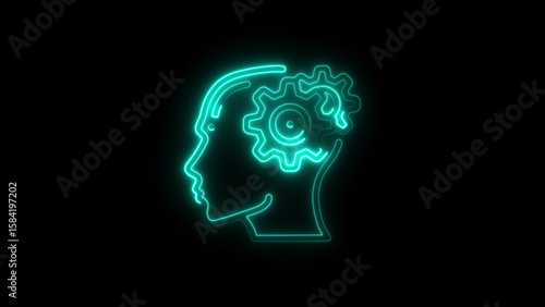 Glowing neon brain with gear inside head conceptualizing thinking and intelligence