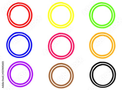 Glowing neon circle frame with spiral effect and abstract lines, creating a futuristic look on a white background. Red, yellow, green, blue, pink, orange, purple, brown, black.