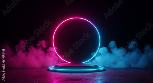 Glowing neon circle on stage with pink and blue smoke image