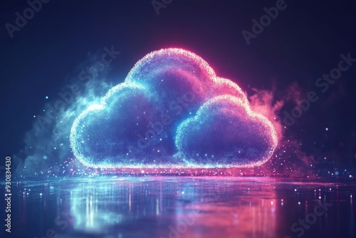 Glowing neon cloud hovering over a reflective surface representing the vibrant energy and futuristic potential of cloud computing technology in a digital landscape