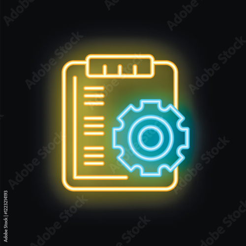 Glowing neon icon representing the concept of project management with a clipboard and gear