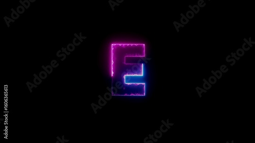 Glowing neon letter e in vibrant pink and blue colors against a black background