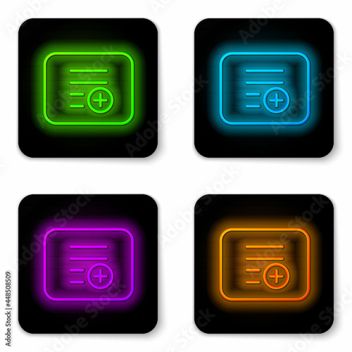 Glowing neon line Add to playlist icon isolated on white background. Black square button. Vector