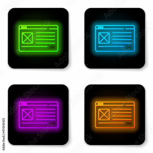 Glowing neon line Browser window icon isolated on white background. Black square button. Vector