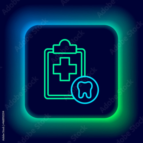 Glowing neon line Clipboard with dental card or patient medical records icon isolated on black background. Dental insurance. Dental clinic report. Colorful outline concept. Vector