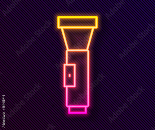 Glowing neon line Flashlight icon isolated on black background. Vector