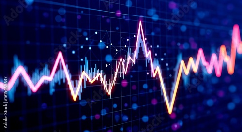 Glowing Neon Line Graph with Abstract Bokeh Lights on Dark Blue Grid Background chart data