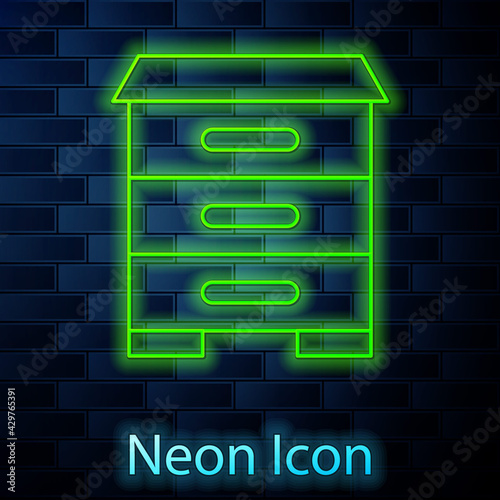 Glowing neon line Hive for bees icon isolated on brick wall background. Beehive symbol. Apiary and beekeeping. Sweet natural food. Vector