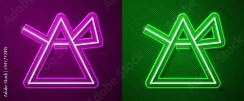 Glowing neon line Light rays in prism icon isolated on purple and green background. Ray rainbow spectrum dispersion optical effect in glass prism. Vector Illustration