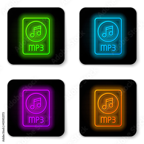 Glowing neon line MP3 file document. Download mp3 button icon isolated on white background. Mp3 music format sign. MP3 file symbol. Black square button. Vector