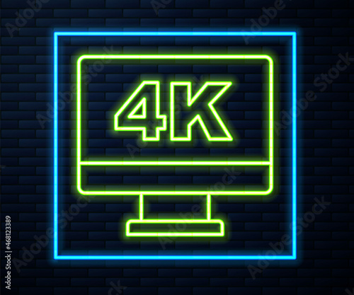 Glowing neon line Screen tv with 4k Ultra HD video technology icon isolated on brick wall background. Vector