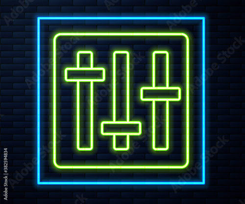 Glowing neon line Sound mixer controller icon isolated on brick wall background. Dj equipment slider buttons. Mixing console. Vector.