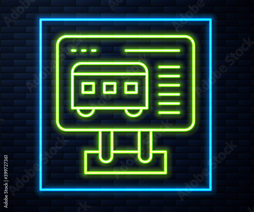 Glowing neon line Ticket office to buy tickets for train or plane icon isolated on brick wall background. Buying tickets. Ticket service. Vector.