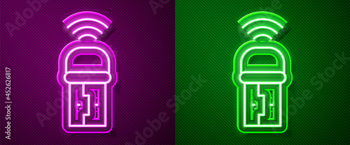 Glowing neon line Usb wireless adapter icon isolated on purple and green background. Vector