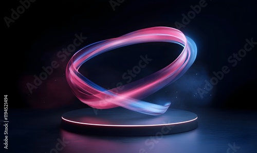 Glowing neon pink and blue light swirl on dark platform.