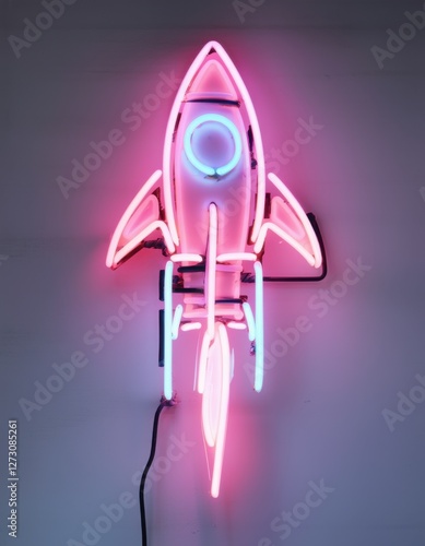 Glowing neon rocket sign in vibrant pink with yellow flames, mounted on a dark wall, casting a soft glow and symbolizing speed, innovation, progress, and futuristic concepts