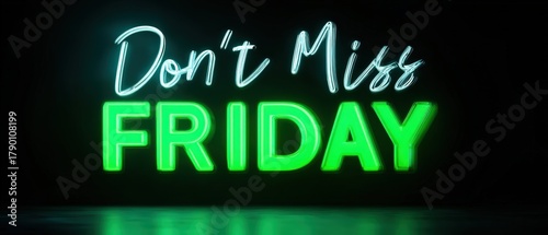 Glowing Neon Sign: Dont Miss Friday Bright green and blue neon lights on a black background, perfect for advertising, promotion, and special event announcements