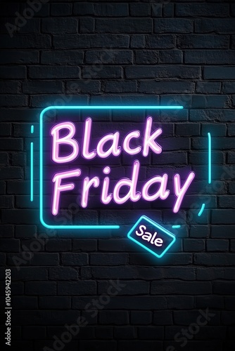 Glowing Neon Sign-Style "Black Friday Sale" Banner with Minimal Discount Tag on Black Brick Background
