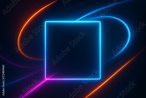 Glowing neon square frame with dynamic colorful light streaks on dark futuristic background for modern technology or creative digital design concepts. Ai generative